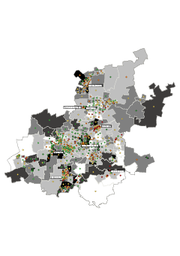 Economic activity across Gauteng using the AfriGIS/Matrix Marketing’s BizCount 2010 database of companies to generate a hotspot analysis of the total number of firms per square kilometre, using a 2km radius scale.